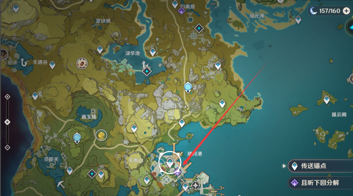 1、首先進入遊戲,點擊傳送至璃月城錨點,移動人物前往任務點。