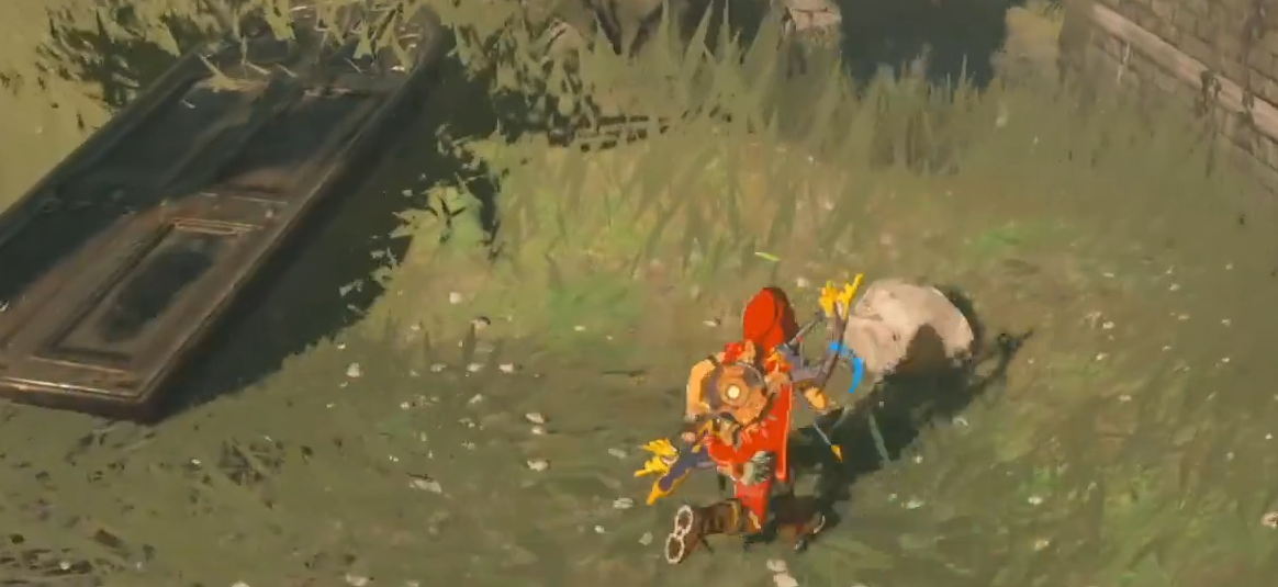 向西到海拉魯大聖堂遺跡,炸開覆蓋石頭的樹葉,搬開石頭即可獲得