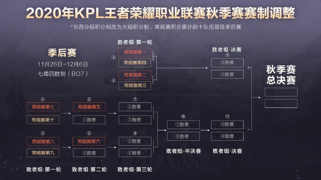 賽制變動:KPL秋季賽【取消東西部分組】,改為【大組積分制】,即常規賽階段,16支戰隊同為一個大組,每支戰隊與所有對手交手一次,積分前10晉級季後賽,其中積分前4的戰隊晉級勝者組,5-10名晉級敗者組