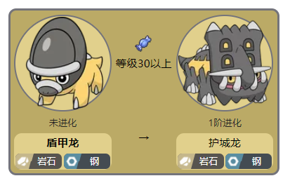 在寶可夢阿爾宙斯中,盾甲龍是岩石與鋼屬性的寶可夢,如下圖所示,盾甲龍需要自身等級達到【30級以上】後才可進化成護城龍。