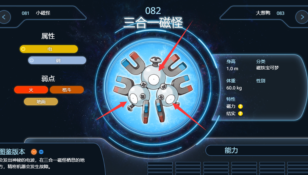 首頁 寶可夢傳說:阿爾宙斯 問答 三合一磁怪和彷徨夜靈有幾隻眼睛? 2022-07-19 1、在寶可夢阿爾宙斯中,三合一磁怪是電與鋼屬性的寶可夢,如下圖所示,該寶可夢一共有三隻眼睛。2、彷徨夜靈是幽靈屬性的寶可夢,如下圖所示,該寶可夢只有一隻眼睛。