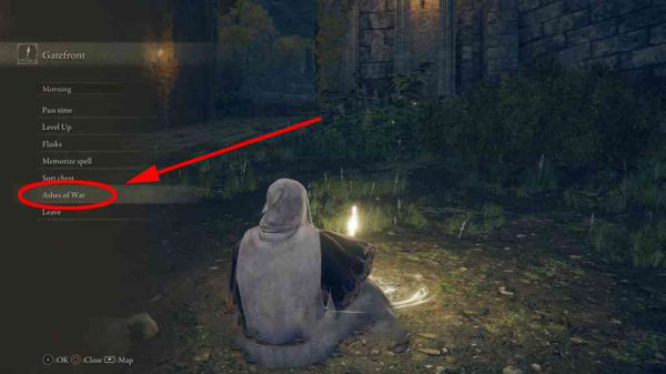 2.前往任意一處賜福,選擇菜單上的「戰灰」選項,就可以將背包里的戰灰添加到武器上了。