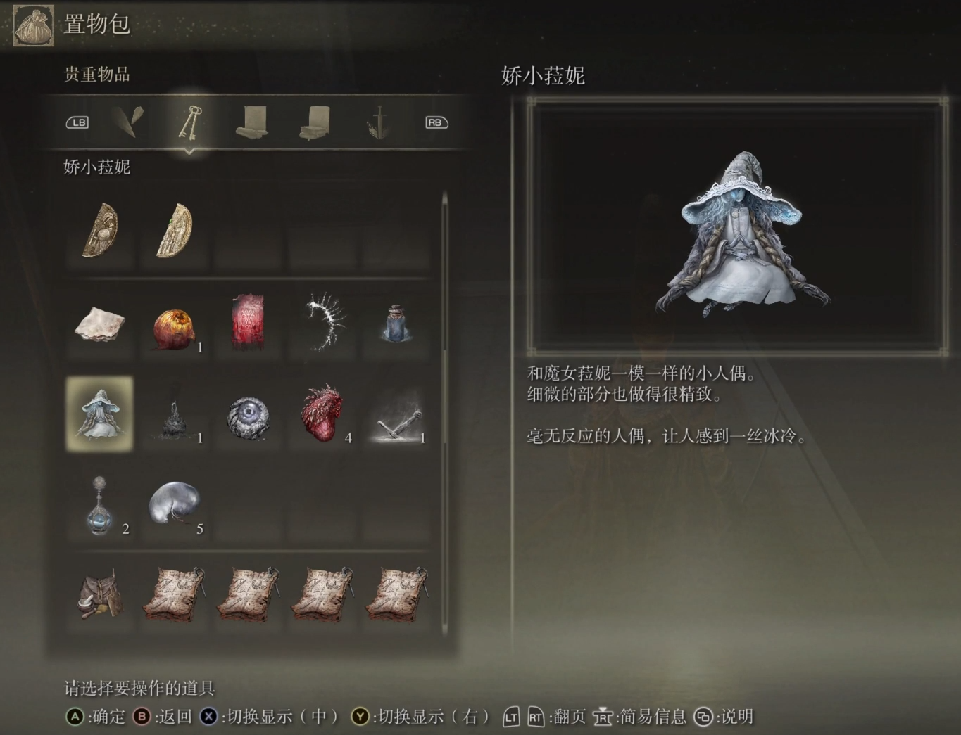 在艾爾登法環中,玩家可以將自己獲取到的裝備及道具放置在自己的置物包倉庫里。置物包倉庫可以用B鍵盤打開,即可看到自己獲取到的相關道具。