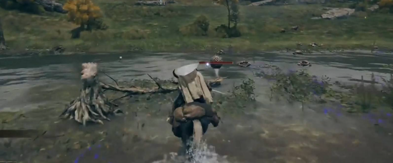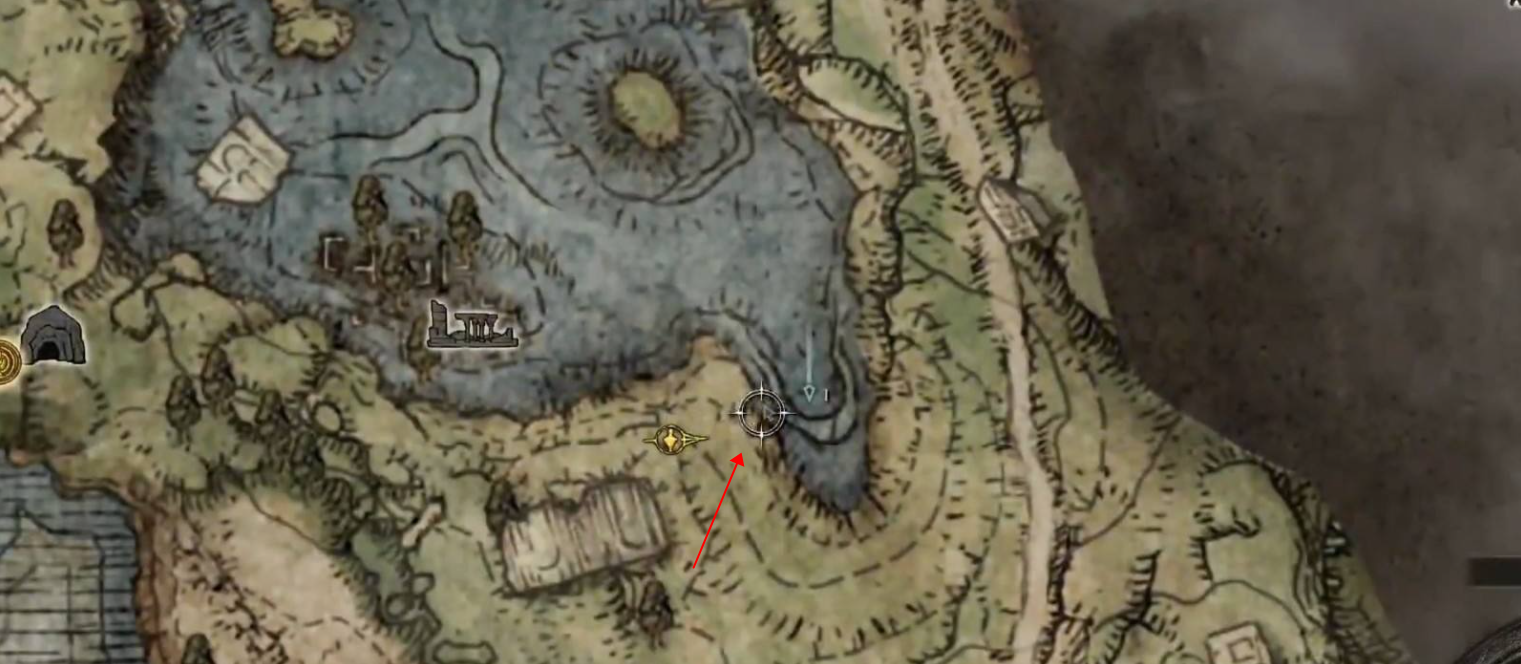 1、在艾爾登法環遊戲中,找到紅色剪頭指向的右下角的湖邊,操控角色前往該處。