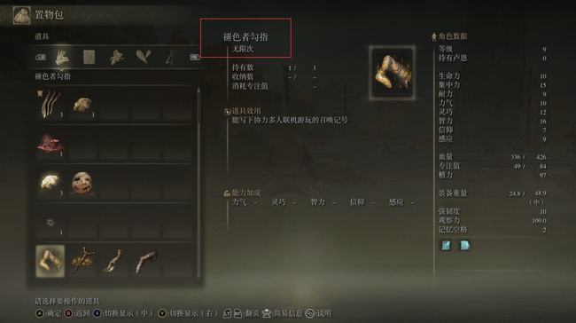 2、點擊進入多人聯機遊玩可以看到艾爾登法環聯機道具,褪色者勾指:寫下召喚印記,其他玩家可用喚勾指召喚你到他的世界;