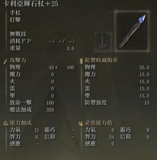 游戲中卡利亞輝石杖還是非常強的。該石杖的攻擊力和防禦能力都是很強的,加點時可以主加點智力,還可以強化卡利亞劍的魔法。