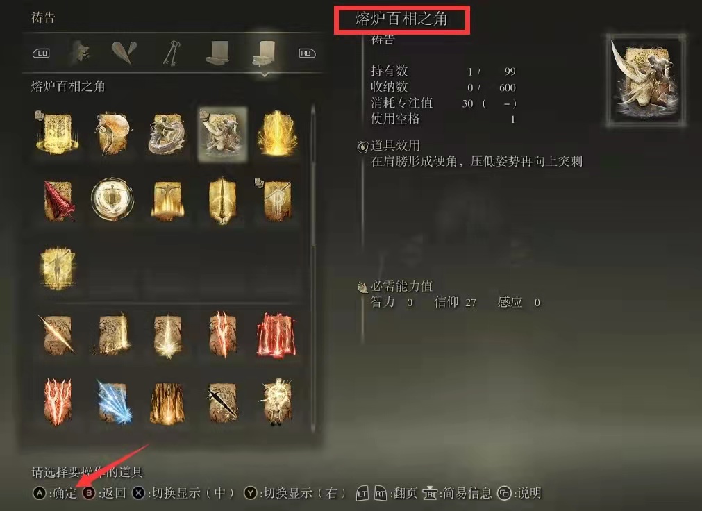 1、在道具背包中找到熔爐百相之角,按照按鍵提示把道具裝備上,熔爐百相之角裝備上後就會自動生成道具效用,它的效用是在肩膀形成硬角、壓低姿勢再向上突刺。