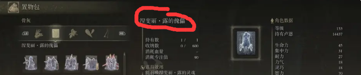 涅斐麗傀儡,能夠召喚艾爾登法環涅斐麗的靈魂,建議不要將藥水交給百智爵士,涅斐麗沒有後續劇情,不用擔心影響結局。