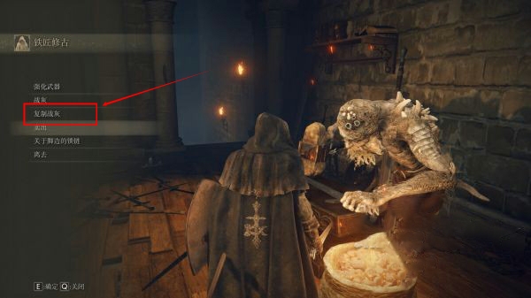 首頁 艾爾登法環 問答 艾爾登法環怎麼復制戰灰? 2022-08-02 大賜福鐵匠處可以給武器用戰灰,當戰灰附著武器之後,此戰灰被使用。如果希望其他武器也用這個戰灰,可以使用道具復制戰灰,或者將其下裝備到其他武器上,如圖下所示。