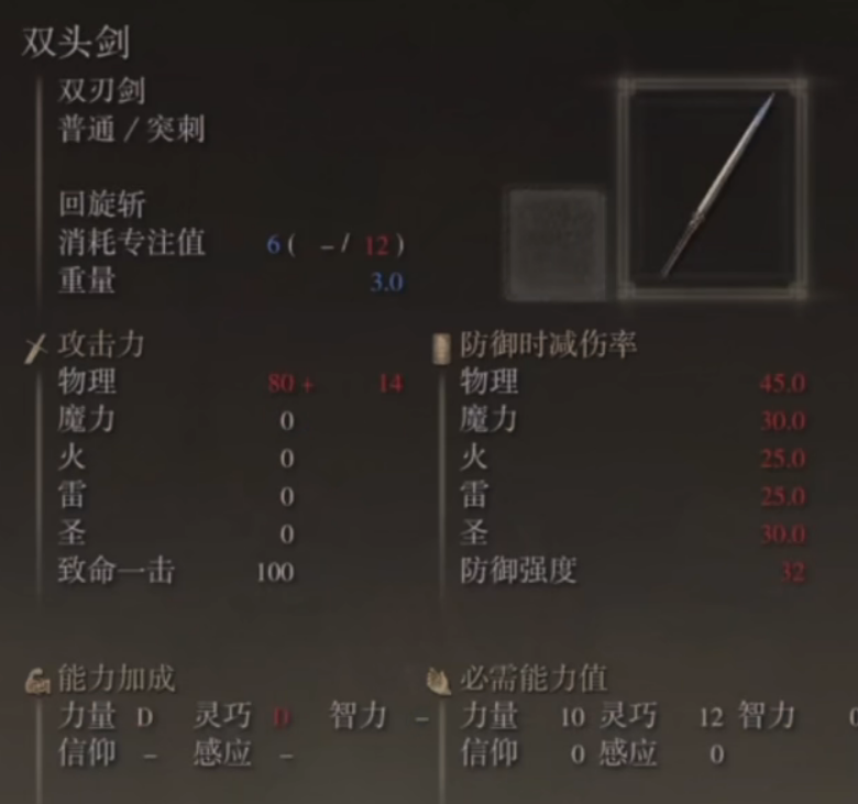 雙頭劍,在龍息廢墟隧道的寶箱內獲得,比較實用,能力需求比較低,很適合新手開荒,另外的新手可以帶一個100的物防盾,加闊劍開荒,容錯率較高,見怪就舉盾即可。流浪者和密探開局自帶100物防盾。玩到中期之後可以替換為大劍,可以帶混種大劍或者領主大劍。