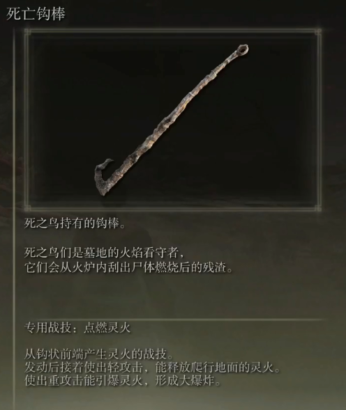死亡鉤棒是一種大劍,力氣靈巧智力等級是DDE,攻擊時主要是物理傷害並帶有魔力屬性,還有附加的攻擊能累積凍傷量表的效果。