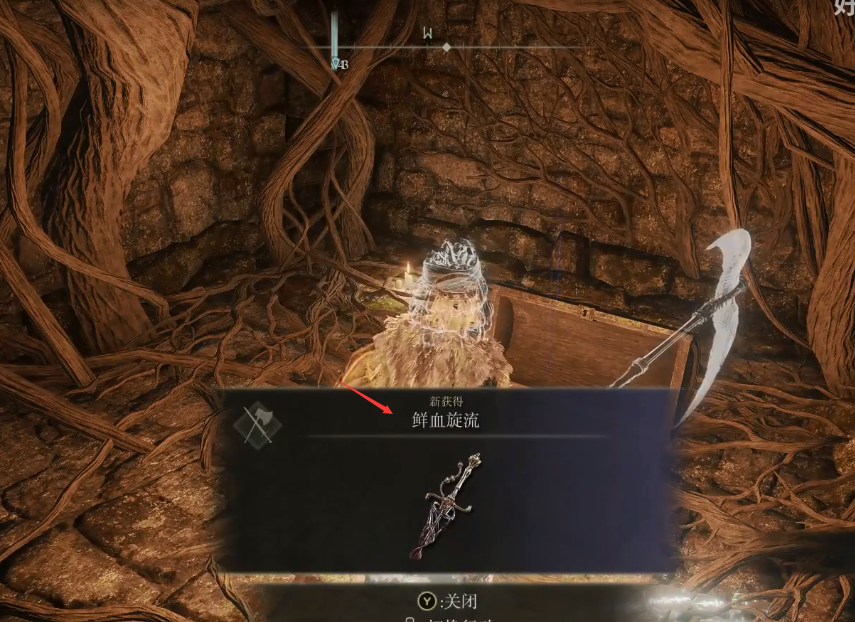 6、進去打開寶箱,我們就能獲得帶有王朝劍技的武器「鮮血旋流」。