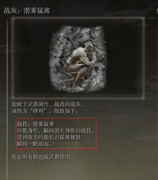 首先我們要知道霧鴉是戰灰「潛霧猛禽」的戰技在使用時的效果,在下圖中潛霧猛禽的戰技使用效果介紹中也可以說明這一點。