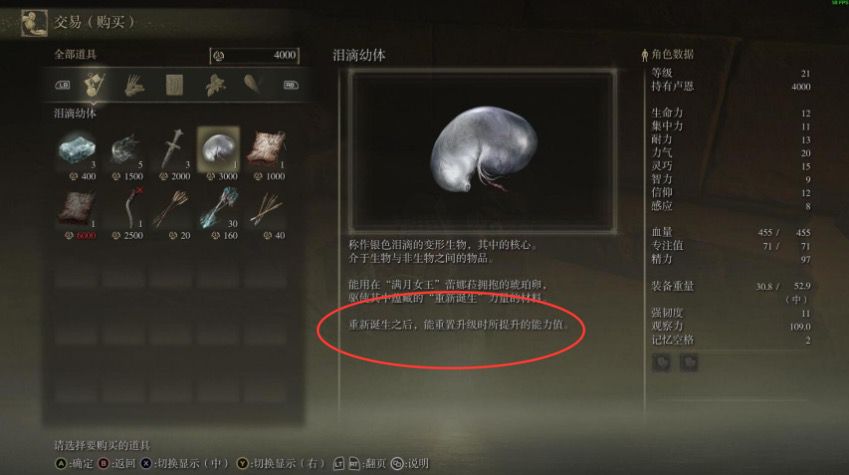 首頁 艾爾登法環 問答 艾爾登法環怎麼重置加點? 2022-08-08 1、艾爾登法環重置加點需要用到淚滴幼體這個道具,這個道具是專門用來洗點的。2、需要找到這個「滿月女王「雷娜拉,然後選擇重新誕生。3、然後選擇是,同意使用淚滴幼體進行重新誕生,也就是重置加點。