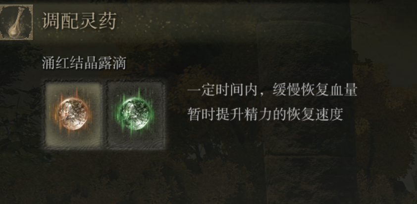在艾爾登法環遊戲中,玩家可以在篝火可以選擇【調配靈葯】,加入最多兩種露滴,並使靈葯聖杯瓶獲得它們的效果。露滴可以隨時替換並且不會消耗。個人測試所有露滴持續時間都是 3 分鍾,調配喝下後就能獲得對應的能力。下圖為調配的是回復血量和精力速度的靈葯。
