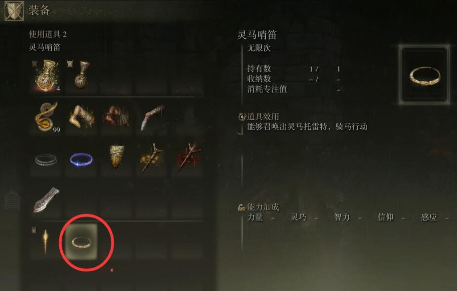 首頁 艾爾登法環 問答 艾爾登法環如何快速騎馬? 2022-08-11 1.在見過梅琳娜後,可以獲得靈馬哨笛,打開裝備欄,裝備上靈馬哨笛,如圖下所示。2.然後切換道具,切換到靈馬哨笛,如圖下所示。3.再按使用道具鍵,就可以召喚馬了,如圖下所示。