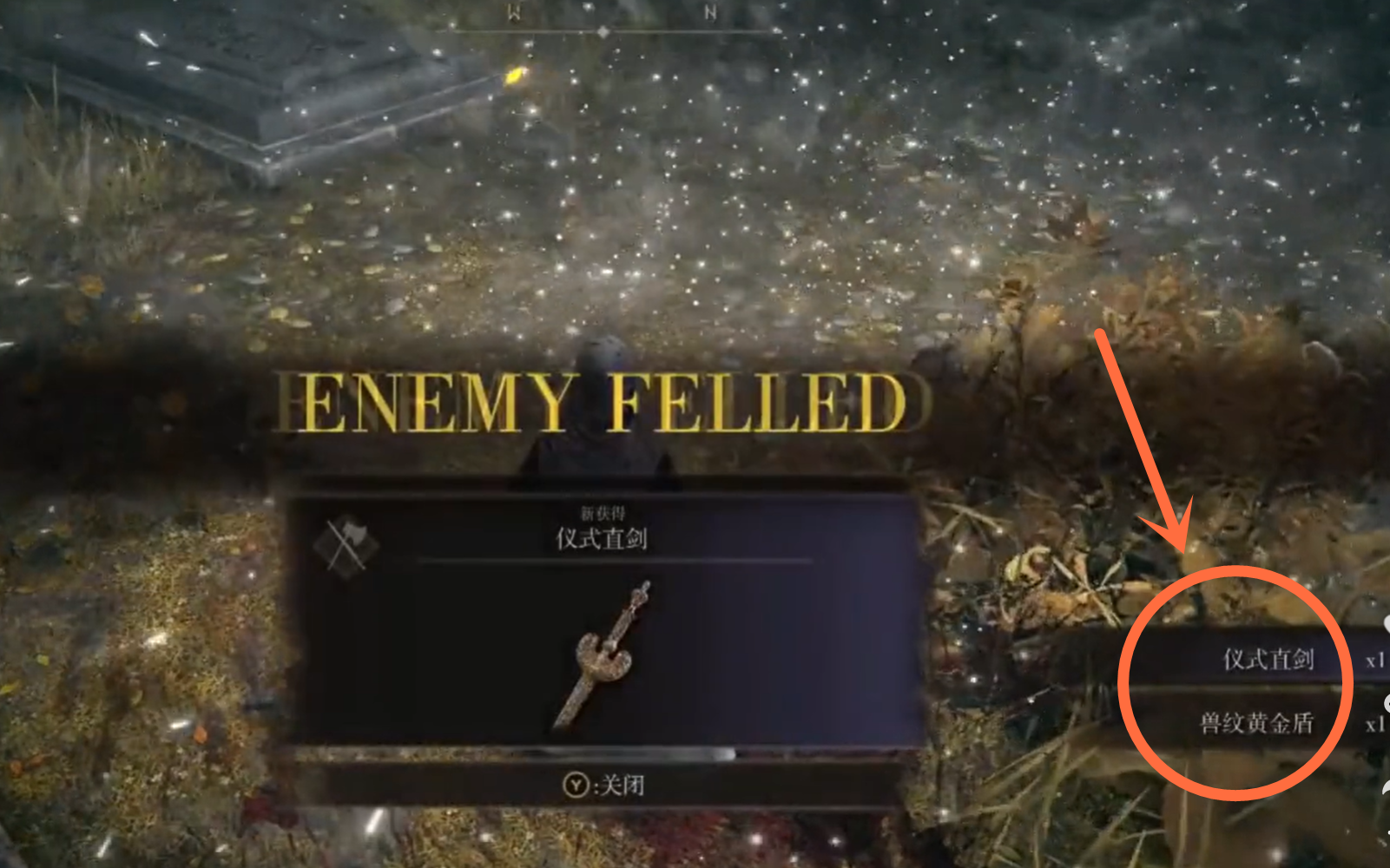 開局BOSS擊敗後,會掉落儀式直劍和獸紋黃金盾,在打BOSS的時候,不要在懸崖邊,盡量靠近中間打,擊敗後就可以掉落東西了。