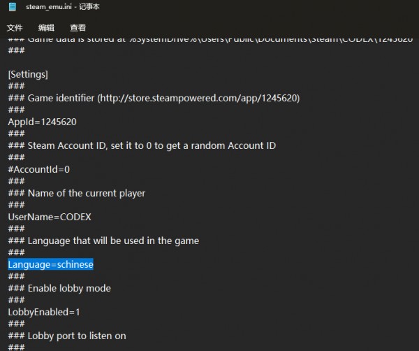 然後找到「Language =」 ,等號後語言改為「schinese」,即可將語言替換成中文,這樣不管是輸入文字還是顯示文字就都是中文了