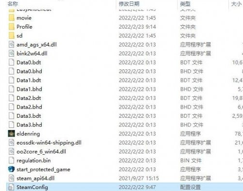 艾爾登法環中文設置方法:首先打開遊戲安裝文件,在根目錄下找到"SteamConfig"文件,右鍵單擊使用記事本打開,具體如下圖