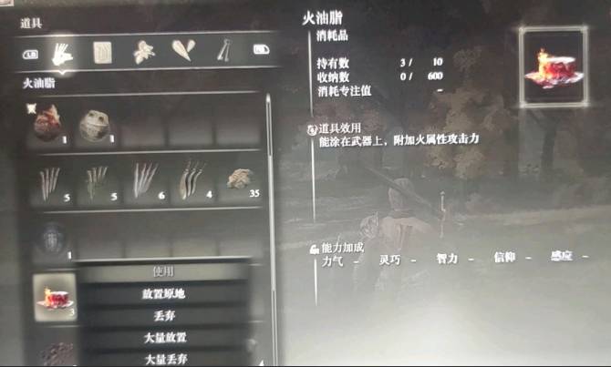 首頁 艾爾登法環 問答 艾爾登法環魔力油脂怎麼用? 2022-08-14 玩家可以把火油脂塗在武器上,從而使武器附加火屬性攻擊力,接著在裝備之後點擊「使用」按鈕就可以了,不過要注意當武器已經是自帶屬性的話,那麼火油脂就無法使用附魔功能了。以上為火油脂的使用方法,希望可以幫助到小夥伴。