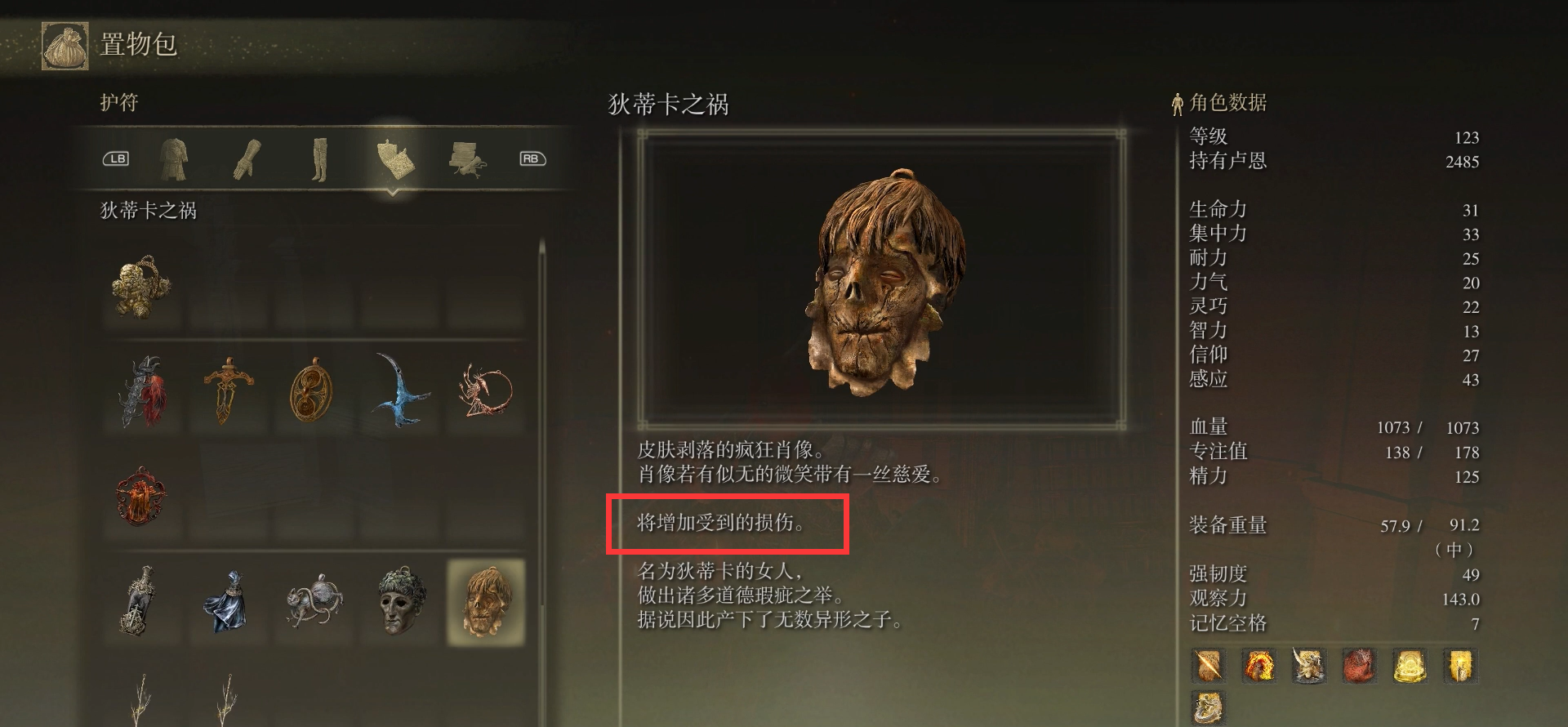 首頁 艾爾登法環 問答 艾爾登法環狄蒂卡之禍護符有什麼用? 2022-08-14 艾爾登法環狄蒂卡之禍護符是玩家可以在火山官邸獲得的一個比較特殊的護符,該護符的描述中寫的道具效用是增加所受到的損傷,字面意思就是攜帶該護符後會更容易受傷,屬於是帶來負面效果的護符,對玩家的冒險沒有好處。