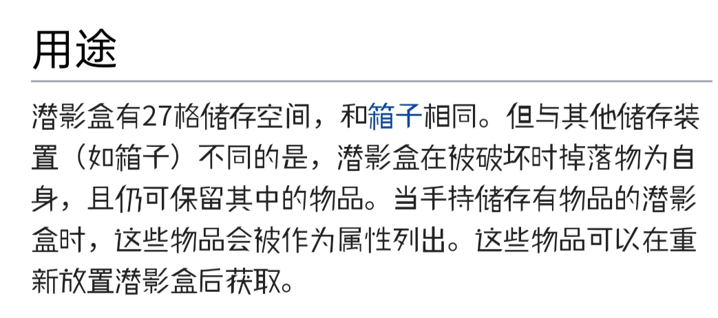 首頁 我的世界 問答 我的世界潛影盒有什麼用? 2022-08-16 潛影盒有27格儲存空間,和箱子相同。但與其他儲存裝置(如箱子)不同的是,潛影盒在被破壞時掉落物為自身,且仍可保留其中的物品。當手持儲存有物品的潛影盒時,這些物品會被作為屬性列出。這些物品可以在重新放置潛影盒後獲取。