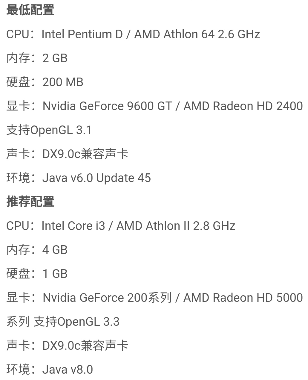 通過搜索我的世界官網可知,玩家如果想下載這款游戲的話,最少要給這款游戲留有2GB的內存,推薦配置是4GB,內存太小的話會裝不下這款游戲。
