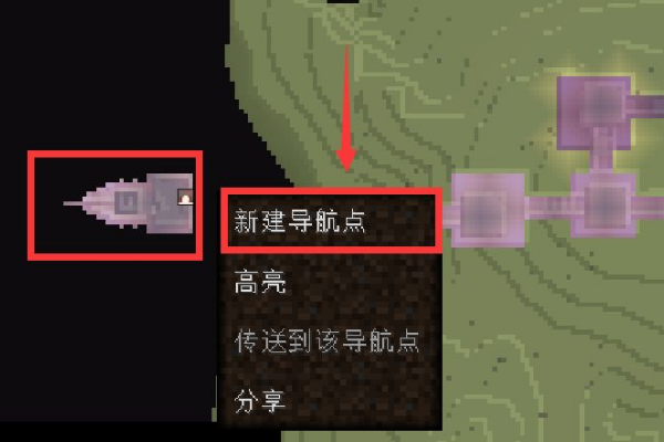 5、在地圖中類似於紫色的建築就是末地船,按下右鍵選擇「新建導航點」。