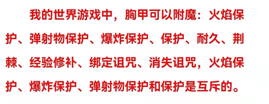 首頁 我的世界 問答 我的世界胸甲可以附魔什麼屬性? 2022-08-23 我的世界遊戲中,胸甲可以附魔:火焰保護、彈射物保護、爆炸保護、保護、耐久、荊棘、經驗修補、綁定詛咒、消失詛咒,火焰保護、爆炸保護等,彈射物保護和保護是互斥的。