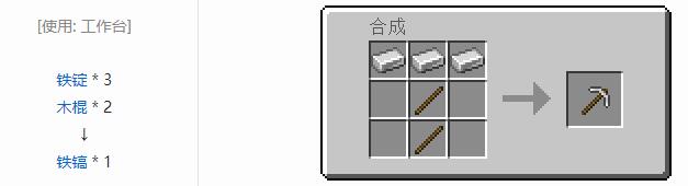 2,接著我們按住如圖所示配方,使用三個鐵錠和兩根木棍就可以合成鐵鎬了。