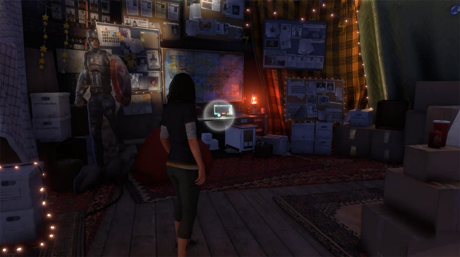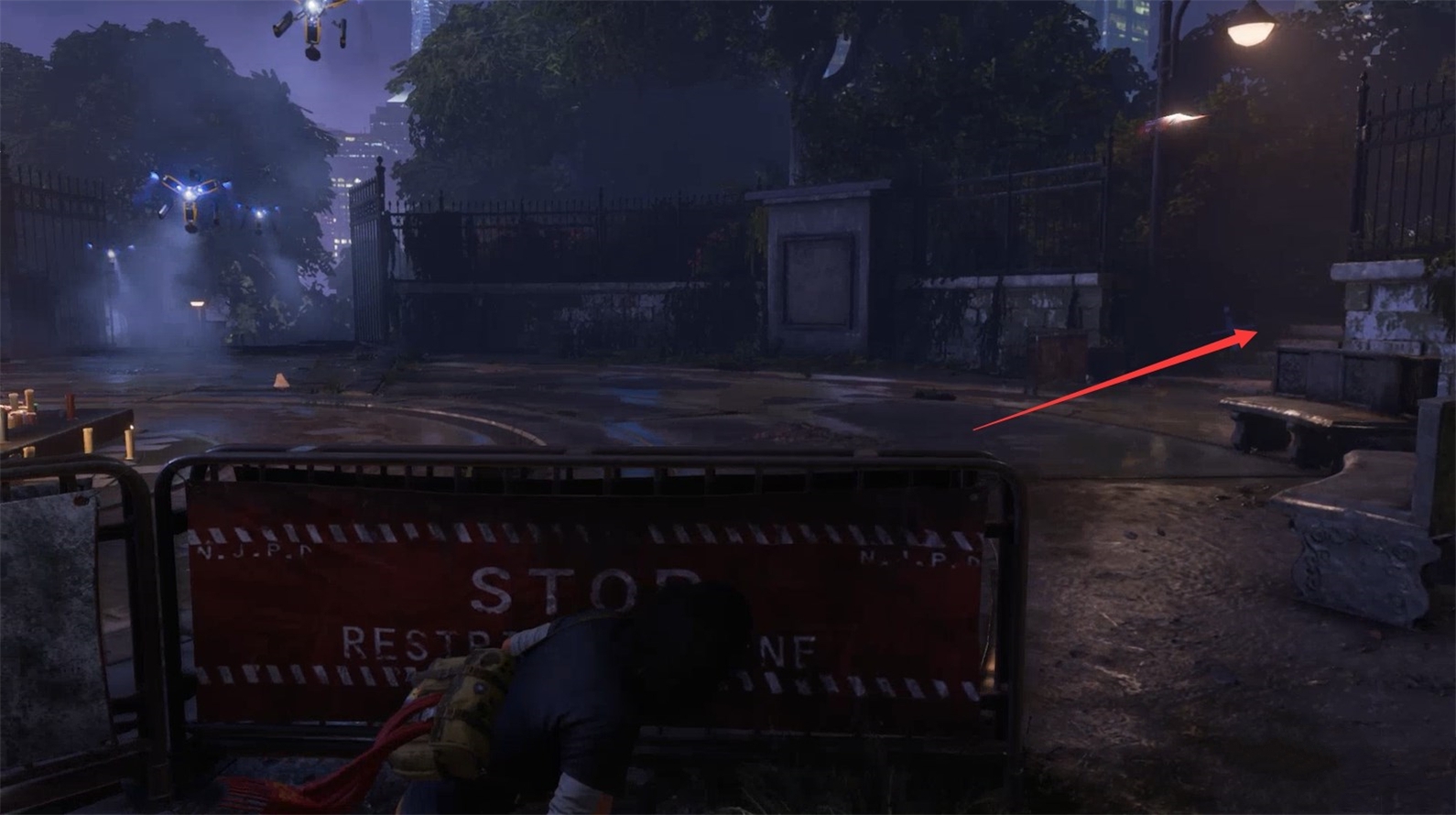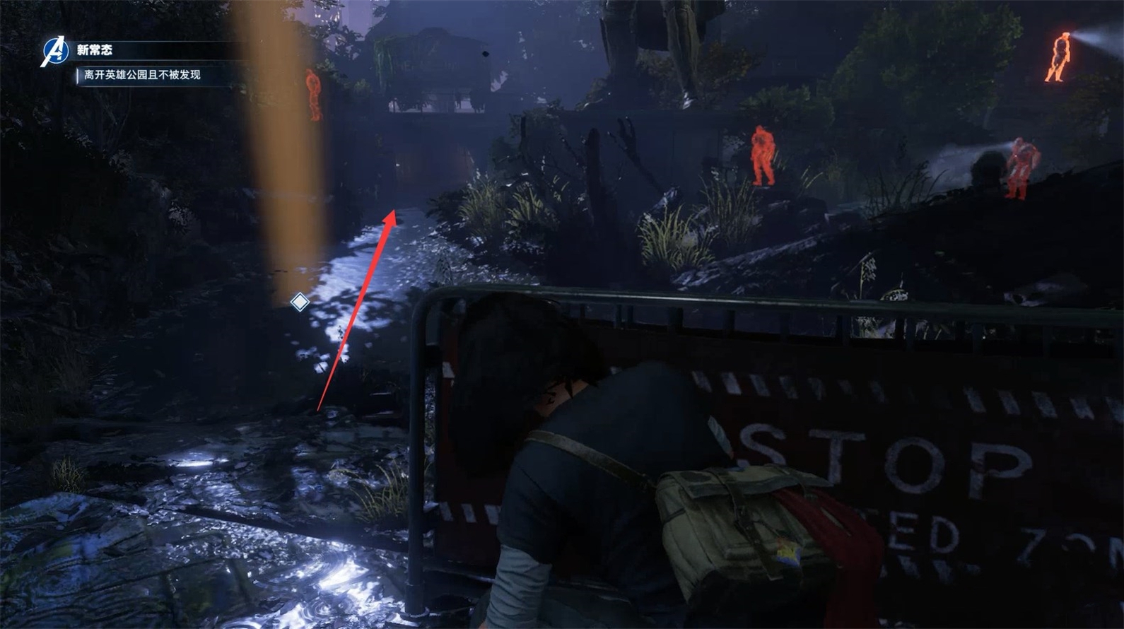 來到英雄公園,隊長的雕像前遭遇機器人追捕,注意利用掩體躲在機器人的視線之外,然後潛行離開。