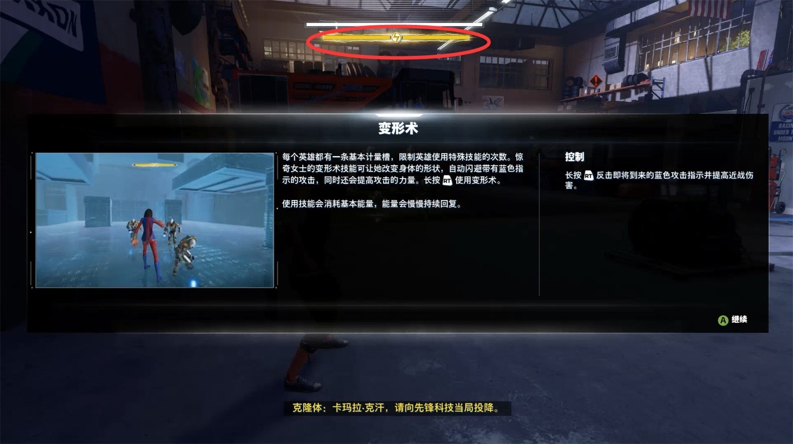 逃亡之後,在倉庫里對戰機器人。每位英雄都有一個基本技能槽,在血條的下方,使用基本技能會消耗這個槽。每個英雄的基本技能都各有特色,卡馬拉的基本技能是「變形術」。