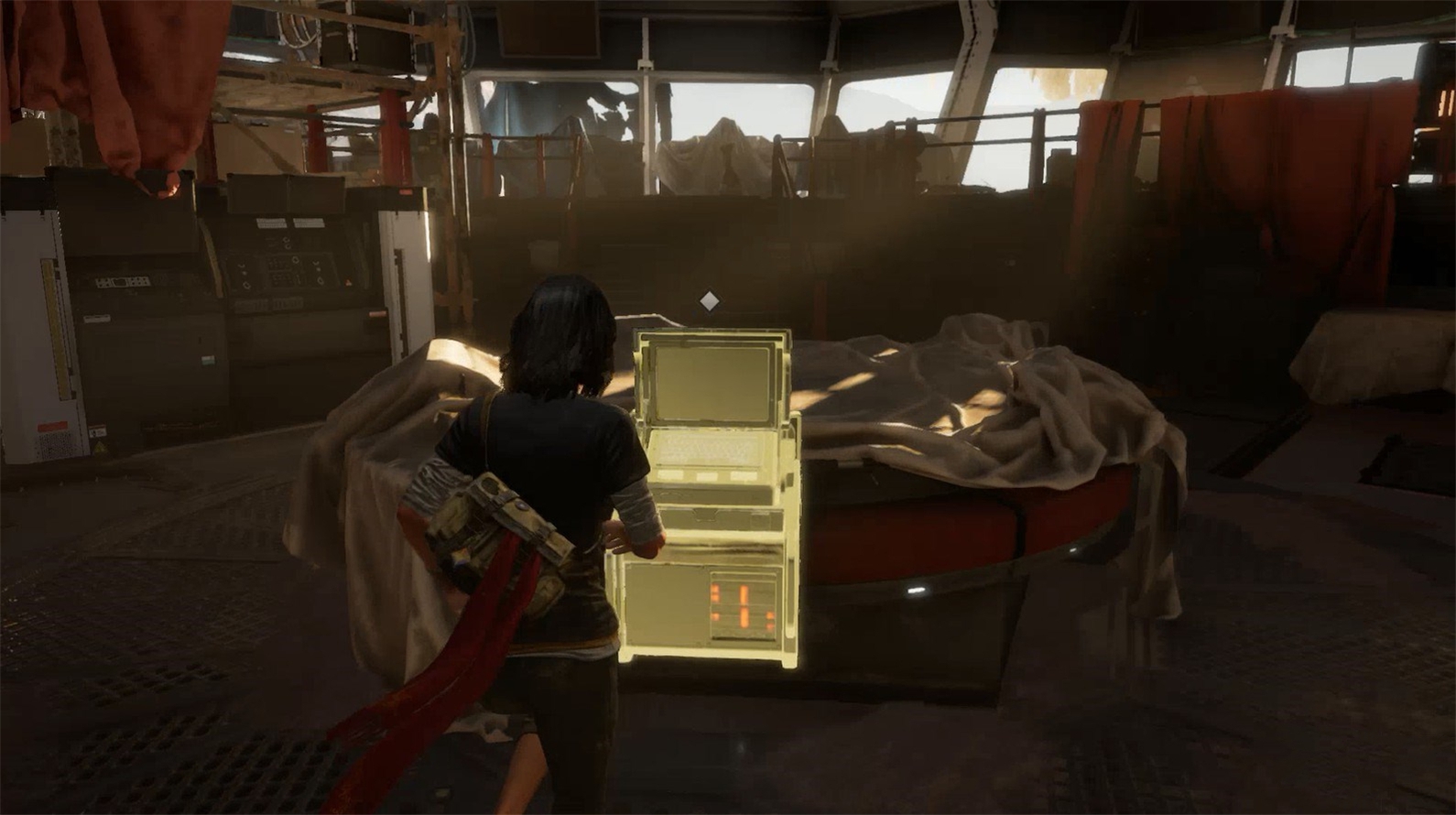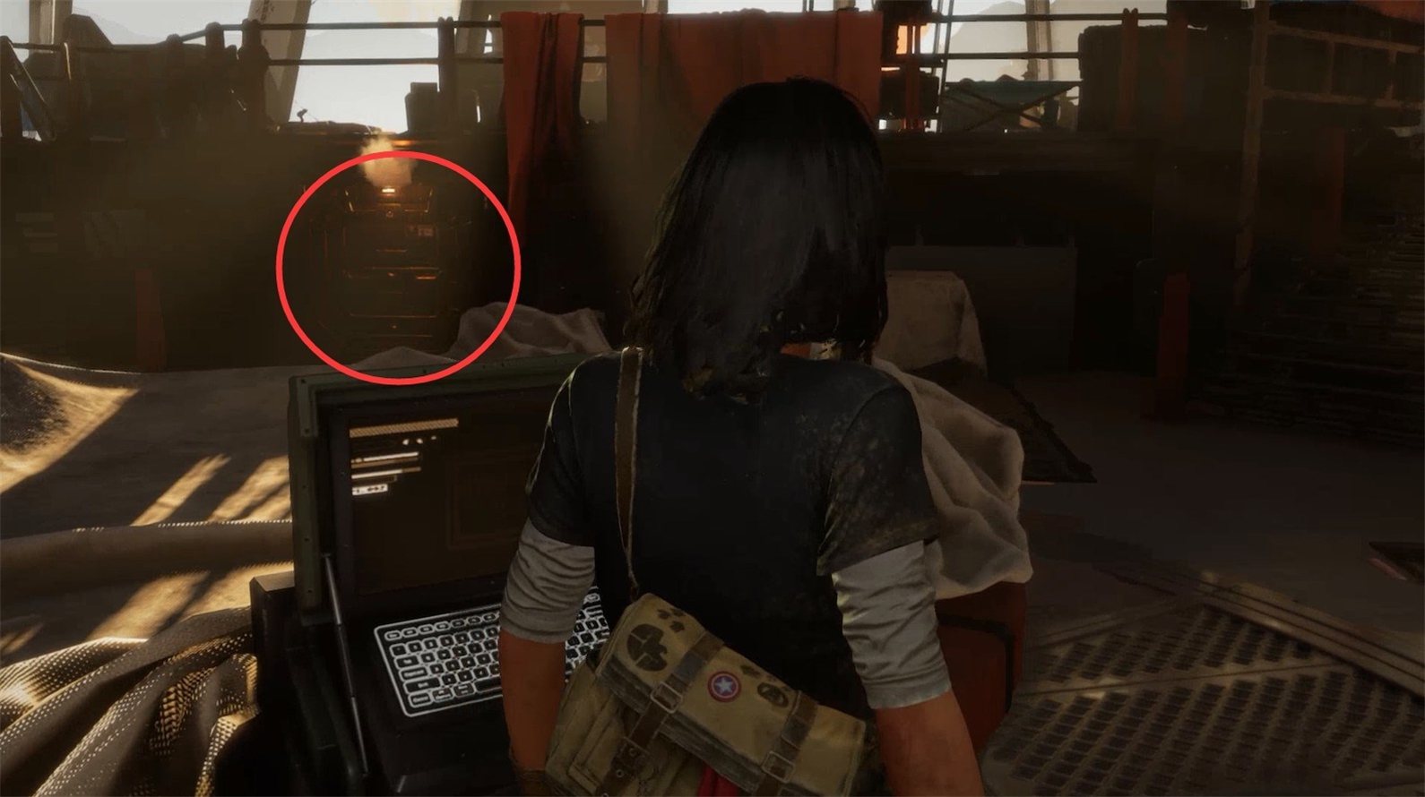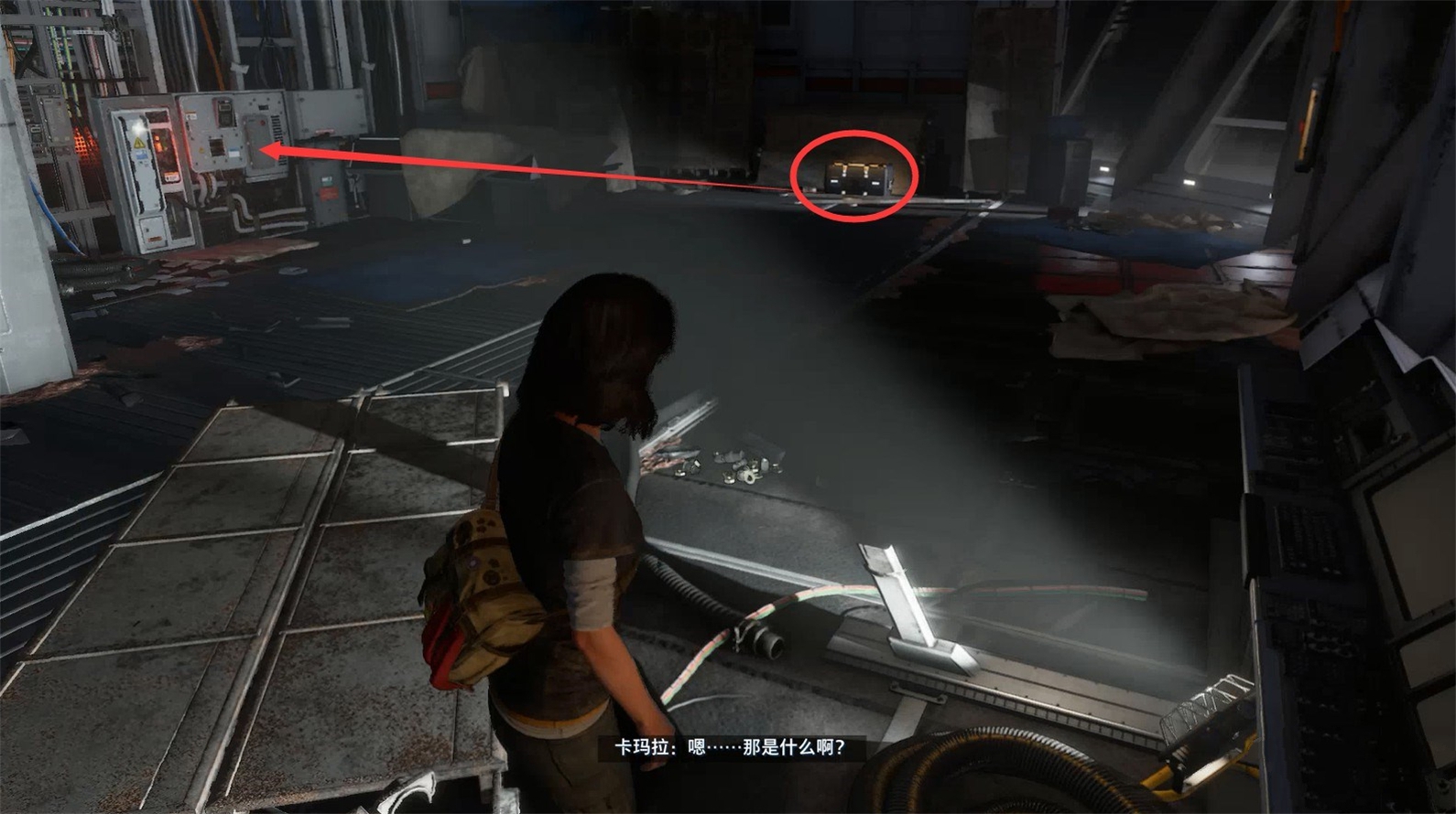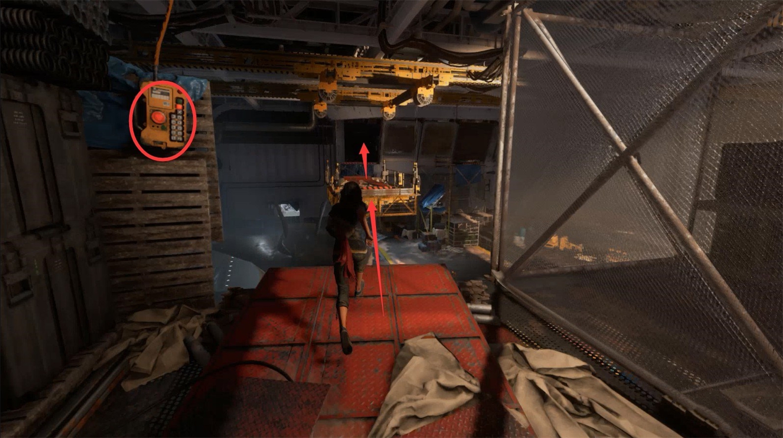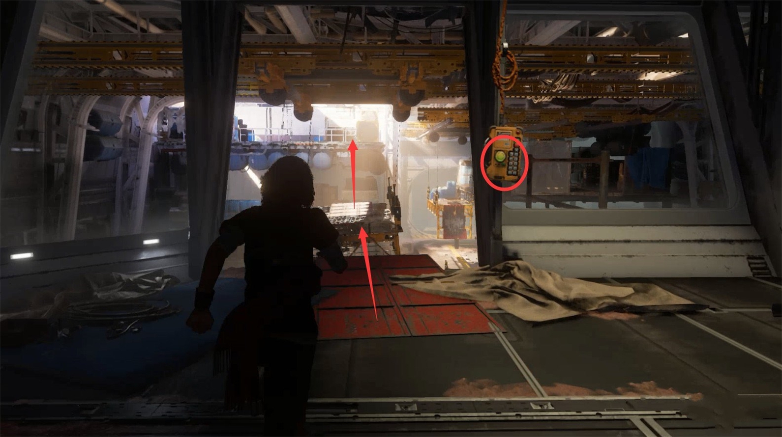 來到機庫,找到並敲擊紅色按鈕,前往機庫上層。