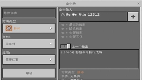 首頁 我的世界 問答 我的世界字幕顯示指令是什麼? 2022-08-25 首先我們需要一個命令方塊(你要有很多話,就要很多命令方塊)然後我們需要一個指令,/title這個指令是用於在你的屏幕中間顯示要說的話,我們在命令方塊中輸入/title @P title 要說的話即可.