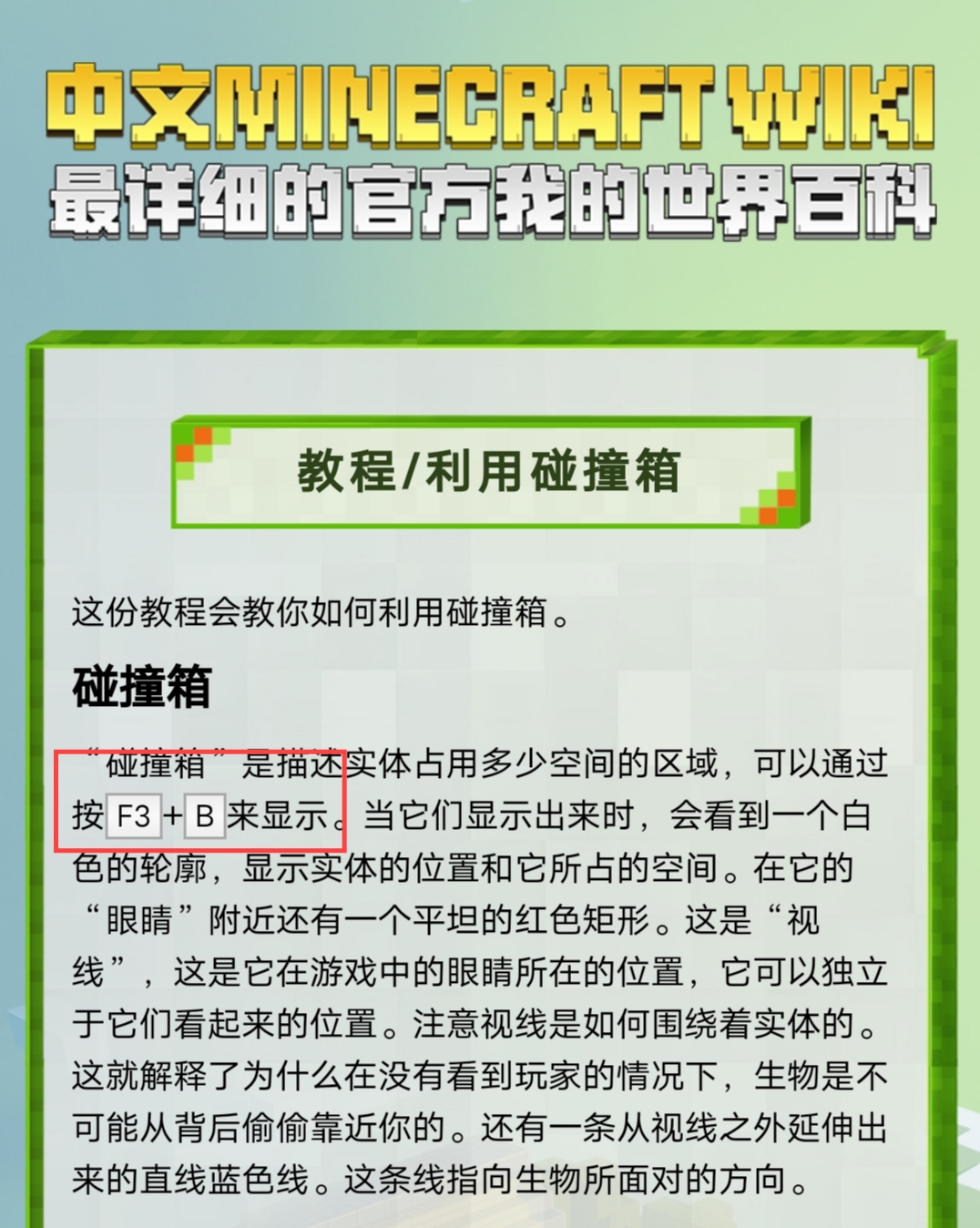 首頁 我的世界 問答 我的世界碰撞箱怎麼做? 2022-08-30 「碰撞箱」是描述實體佔用多少空間的區域,可以通過按F3 B來顯示。當它們顯示出來時,會看到一個白色的輪廓,顯示實體的位置和它所佔的空間。在它的「眼睛」附近還有一個平坦的紅色矩形。通過顯示碰撞箱,你可以看到生物的碰撞箱在哪裡。