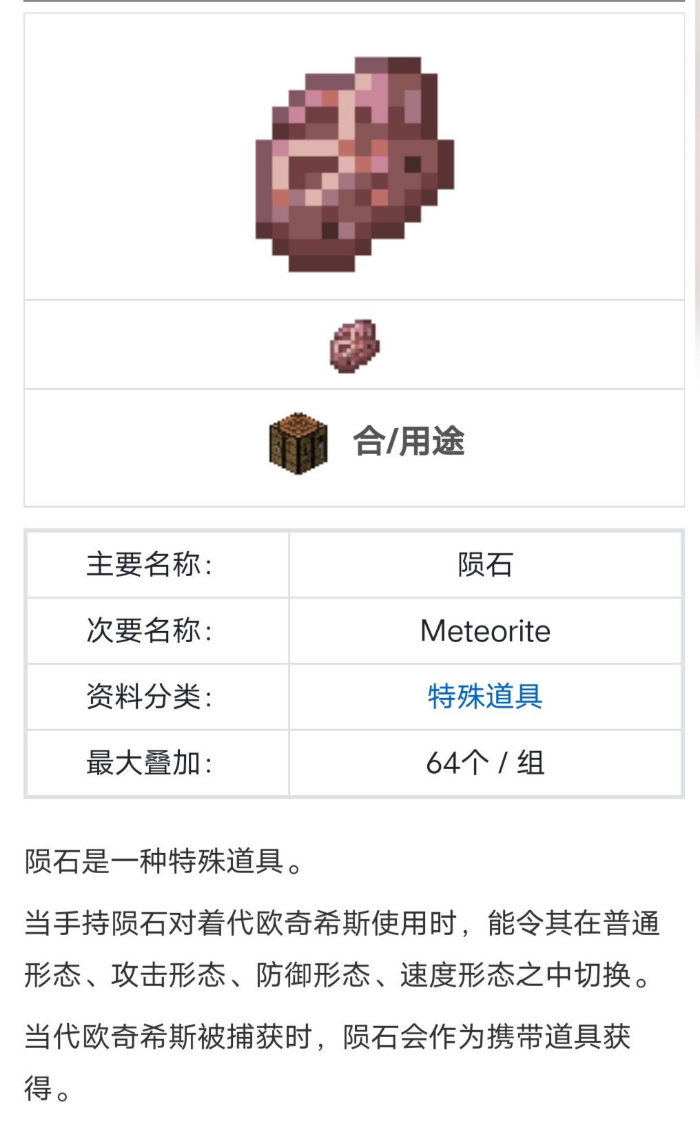 首頁 我的世界 問答 我的世界神奇寶貝隕石有什麼用? 2022-08-31 隕石是一種特殊道具。當手持隕石對著代歐奇希斯使用時,能令其在普通形態、攻擊形態、防禦形態、速度形態之中切換。當代歐奇希斯被捕獲時,隕石會作為攜帶道具獲得。