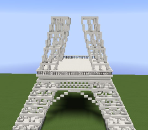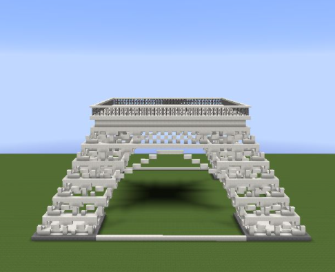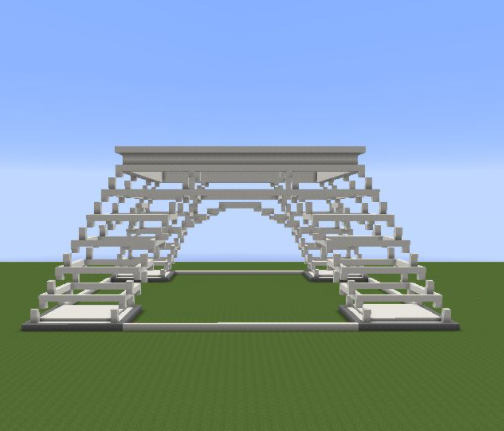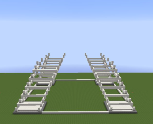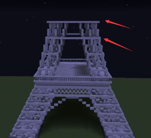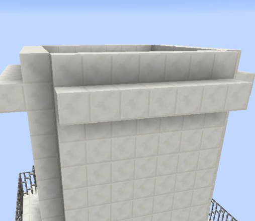 13、頂層用石英塊鋪滿。然後放置兩格高的鐵柵欄圍一圈,鐵柵欄上面鋪一圈石英半磚;