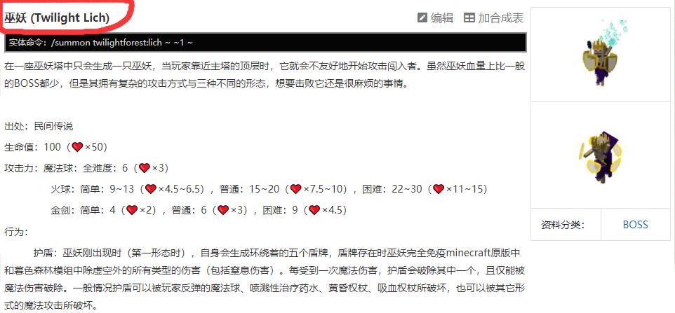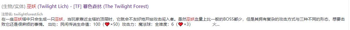 首頁 我的世界 問答 minecraft暮色森林巫妖的英文名是什麼? 2022-09-01 暮色森林巫妖的英文名是Twilight Lich。1,首先我們搜索並進入暮色森林巫妖的說明。2,然後就可以在界面左上角發現巫妖英文名是Twilight Lich了。