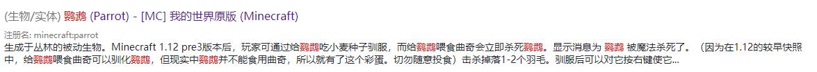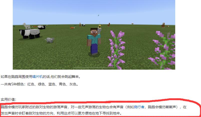 首頁 我的世界 問答 我的世界鸚鵡有什麼用處? 2022-09-02 作用是鸚鵡會模仿玩家附近的敵對生物的游盪聲音,利用這點可以更方便地在地下尋找到地牢。1,首先我們點擊進入鸚鵡的相關說明。2,然後往下滑動,就會發現鸚鵡的作用為更方便地在地下尋找到地牢。