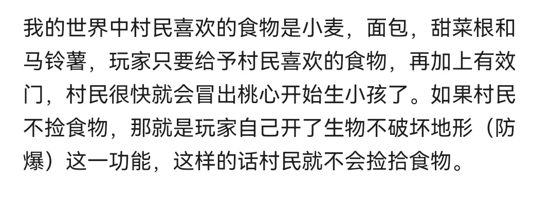 吃的是小麥、麵包、甜菜根和馬鈴薯,玩家只要給予村民喜歡的食物,除此之外,再加上有效門,村民就能夠很快冒出紅心,然後生小孩子了。