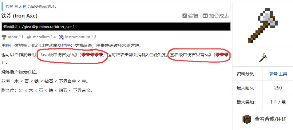 首先我們搜索並進入我的世界鐵斧的相關說明,然後就可以在界面中發現,鐵斧Java版中傷害為9點,基岩版中的傷害為5點。