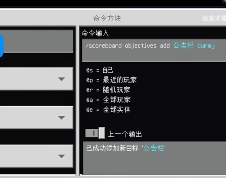 首頁 我的世界 問答 我的世界如何在玩家視頻屏幕上顯示公告攔? 2022-09-04 我的世界公告欄指令 :/scoreboard objectives setdisplay sidebar gg。顯示列表如下:list列表顯示即按TAB可以看到。sidebar側邊欄顯示即右側顯示公告就是用這個的。