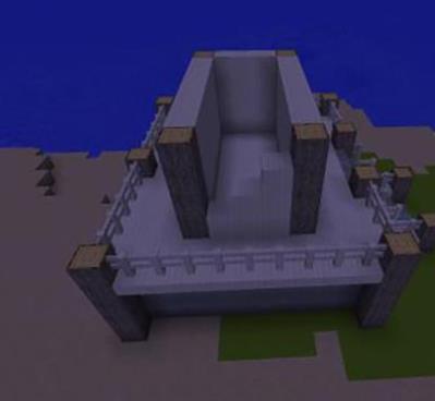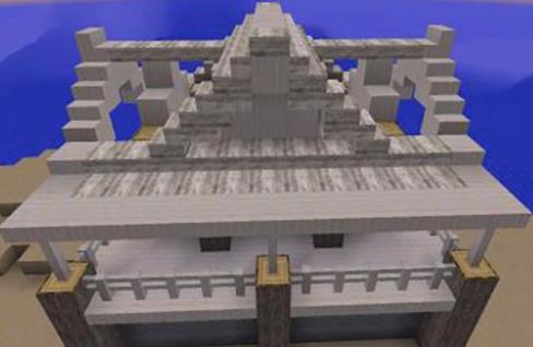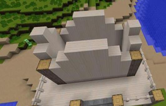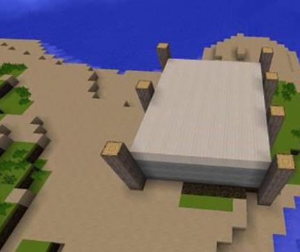 2、將搭建好的地基框架用樺木封頂,然後用原木分別在四個角搭建高度為4的原木柱,然後在長邊3格和7格的位置安放兩個高4格的原木柱,之後在對面長邊6格處安放一個高四格的原木柱子。
