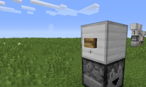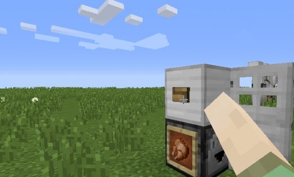 2.在鐵塊的任意一側放上按鈕,在投擲器的一側放物品展示櫃(按shift),櫃子會展示冰箱所放的食物。