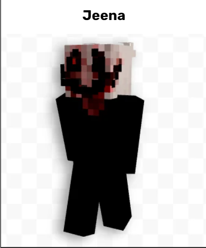 Jeena是Minecraft版本Jeena的世界中登場的一個角色,亞裔美國人,女性,SH的試驗品之一,生日可能是7月19號。SH將Jeena的靈魂植入了一個Minecraft賬號中,這使得Jeena看上去面目可憎。現在的Jeena是一個靈魂。目前Jeena因為肆玖復制存檔而成為了兩個,目前真正的Jeena已經死亡,留下來的是復制體Jeena。