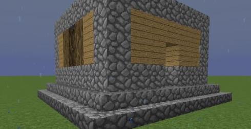 一側是有門的,門下墊個圓石。另外三側都是上下一條圓石,中間是兩側用木板和原木裝飾,中間用欄桿搭建窗戶。