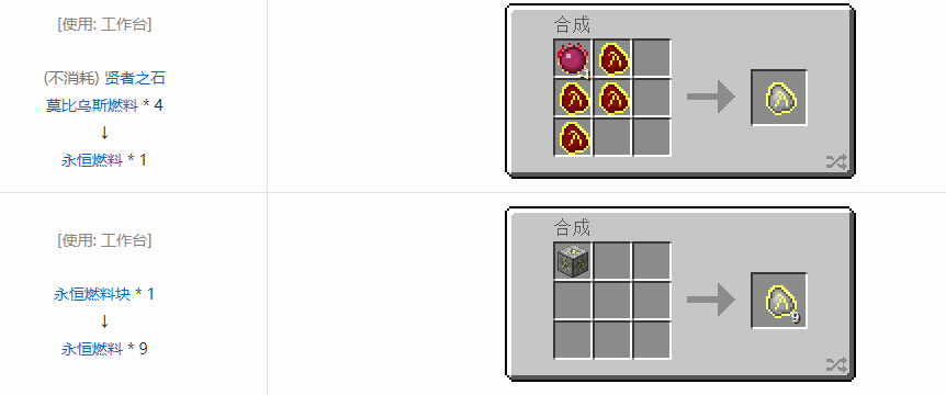 2.莫比烏斯燃料*4和(不消耗)賢者之石得到一份永恆燃料或者永恆燃料塊*1得到永恆燃米料*9,莫比烏斯燃料需要使用1個賢者之石和4個煉金煤炭合成,煉金煤炭則需要1個賢者之石和4個煤炭製作。使用4個紅石、4個熒石粉和1個鑽石就能製作出賢者之石這個材料。