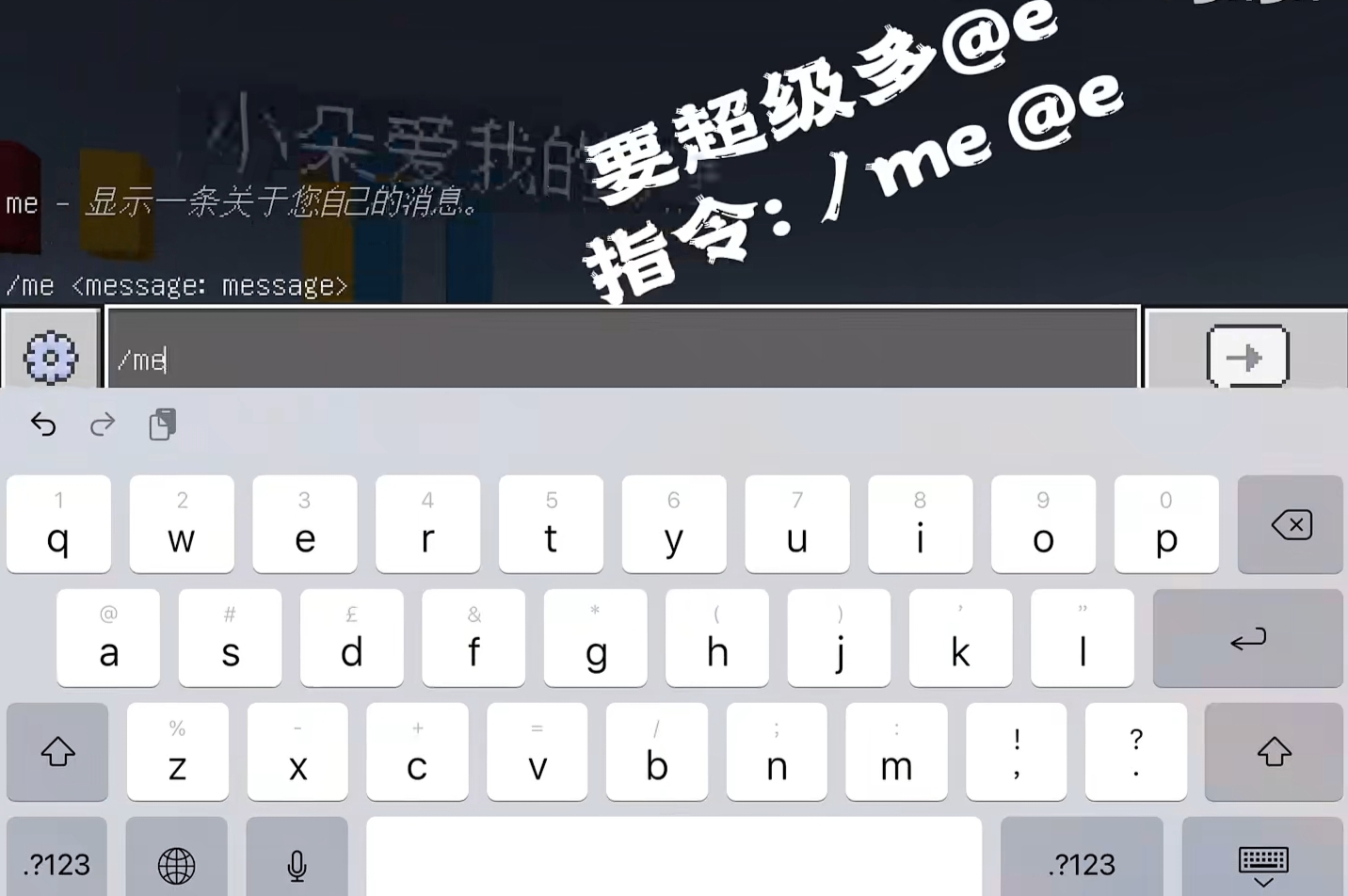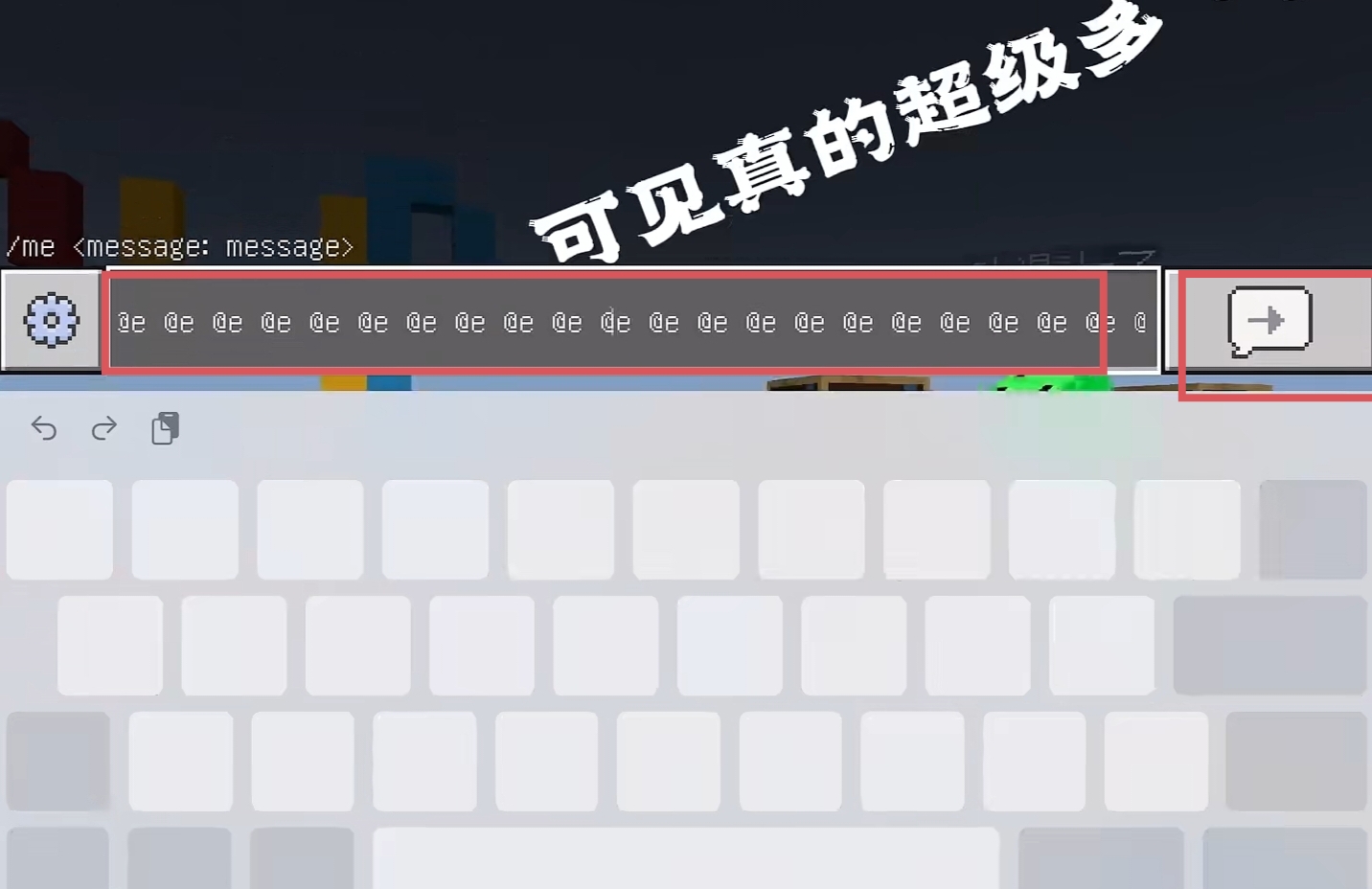 2.@e輸入的越多越好,輸入的越多崩房的概率也就越大,如下圖所示要輸入很多@e,然後按一下發送按鈕,運行這個指令,房間就會直接卡崩掉,這個指令只能在網易版我的世界的房間使用。