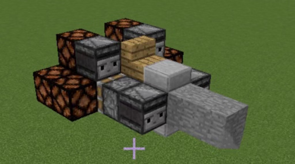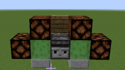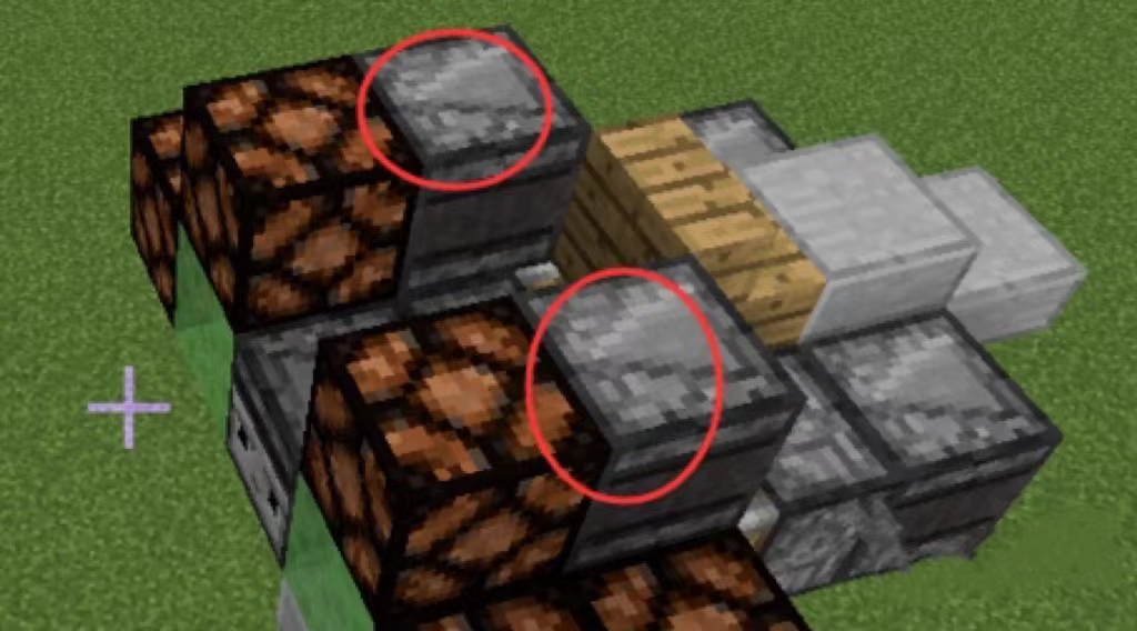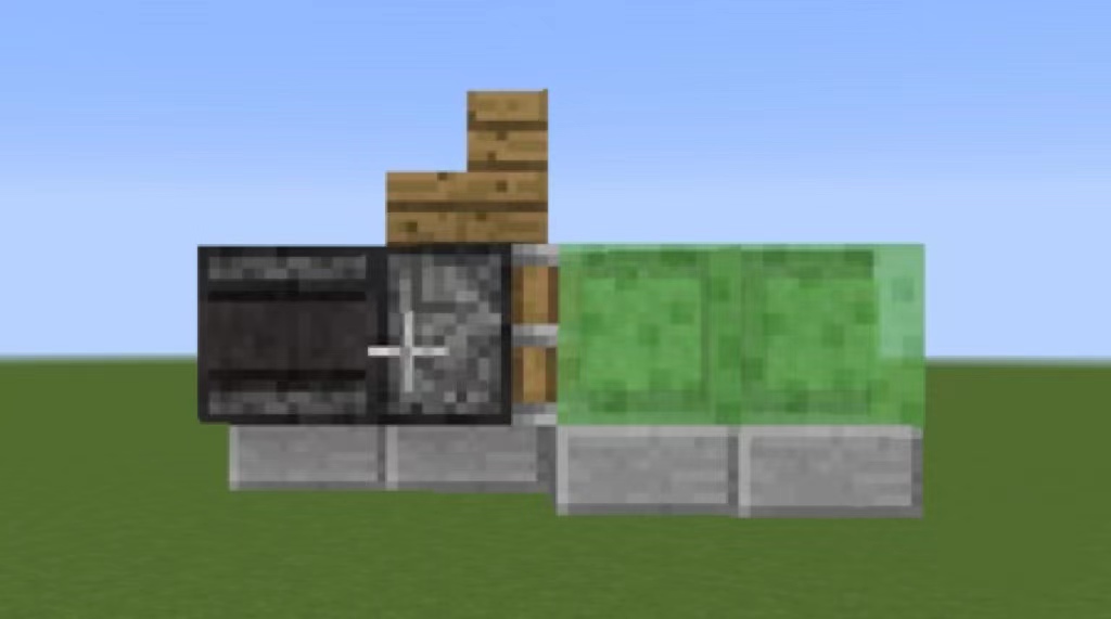 8.第8步:在位於機頭上的粘液塊前放置兩塊石頭,並在這個粘液塊的上面放一塊半磚。