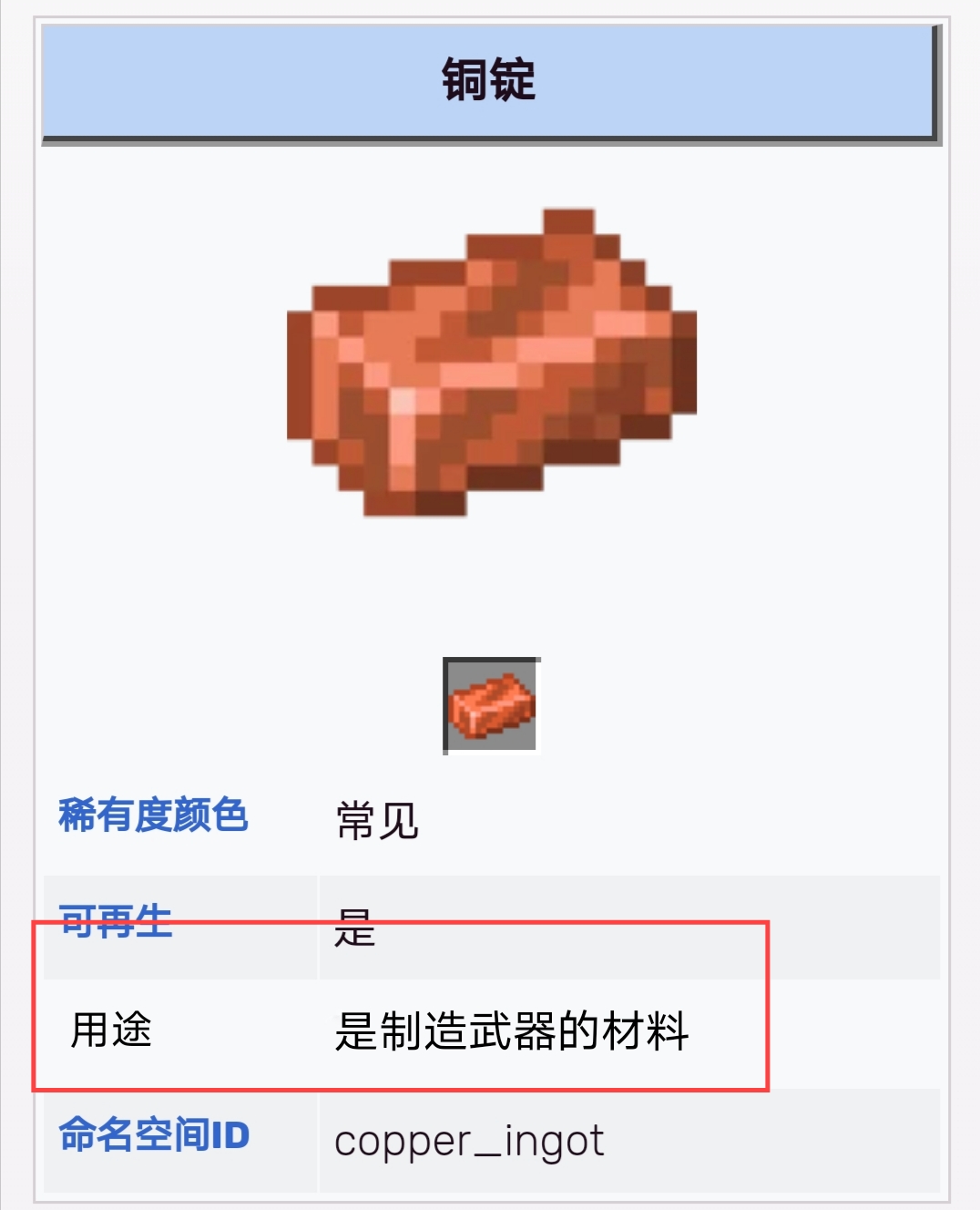 銅錠可以燒成鐵礦 ,做裝備武器 ,還有鐵傀儡 。粗銅是1.17新更的礦物,不過用處不太大,可以做避雷針,是做很多武器所需要的材料。